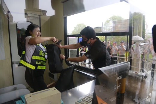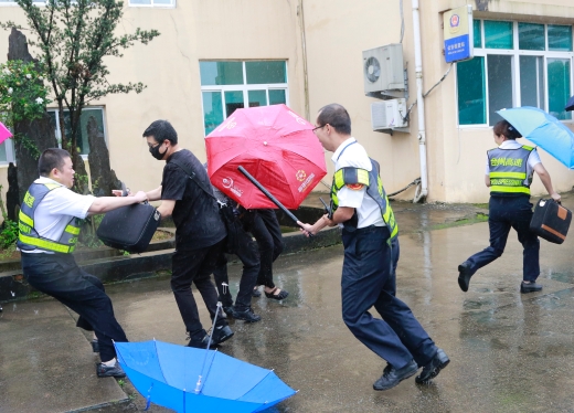 圖為演練現場 隨后,多名參演員工冒雨模擬收費崗亭和列隊下崗遭遇“歹徒”搶劫的情景開展防盜搶演練。現場,2名蒙面歹徒執仿真刀、軟棍威脅收費員交出現金,危機之中,收費站立即啟動應急處置預案并報警求助,收費員有效與歹徒周旋,應急處置組人員迅速攜鋼叉、橡膠棒、勞動工具等赴現場支援,值班領導、收費班長、監控員合力協作應對歹徒,防盜搶演練順利結束。